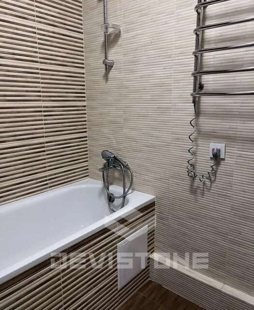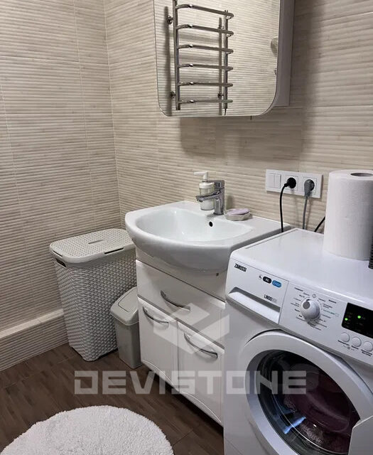 У ванній кімнаті — пральна машина та полотенцесушилка.